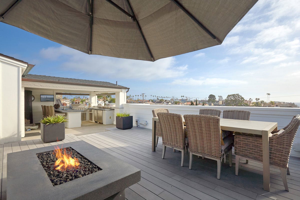 A third-level roof deck with panoramic ocean & Newport Harbor views features an entertaining kitchen – accessible by elevator or staircase. The show-stopping kitchen suite with floor-to-ceiling disappearing doors, Carrara marble countertops, Sub-Zero refrigerator, Wolf six-burner range with double oven, Sub-Zero wine refrigerator & so much more!