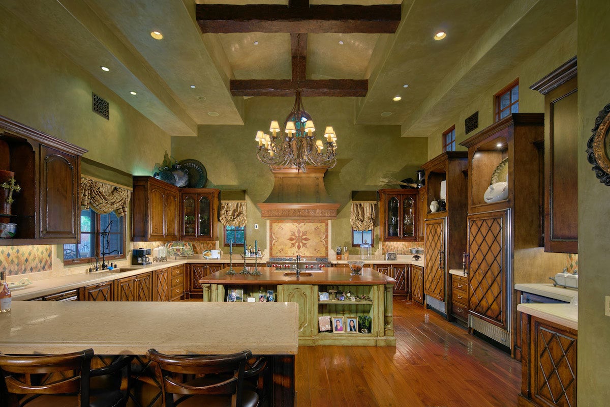 Situated at the end of a quiet cul-de-sac lane on a 28,444 s.f. lot, the 9,813 s.f. residence’s European interiors create an elegant yet casual space to relax or entertain, with soaring ceilings and large, expansive rooms which seamlessly open through walls of glass doors to the inviting and private central courtyard. The expansive grounds offer a fabulous refuge for year-round entertaining with a large sparkling pool with spa, covered loggia with fireplace, outdoor covered kitchen for al fresco dining, emerald lawn and forever views.
