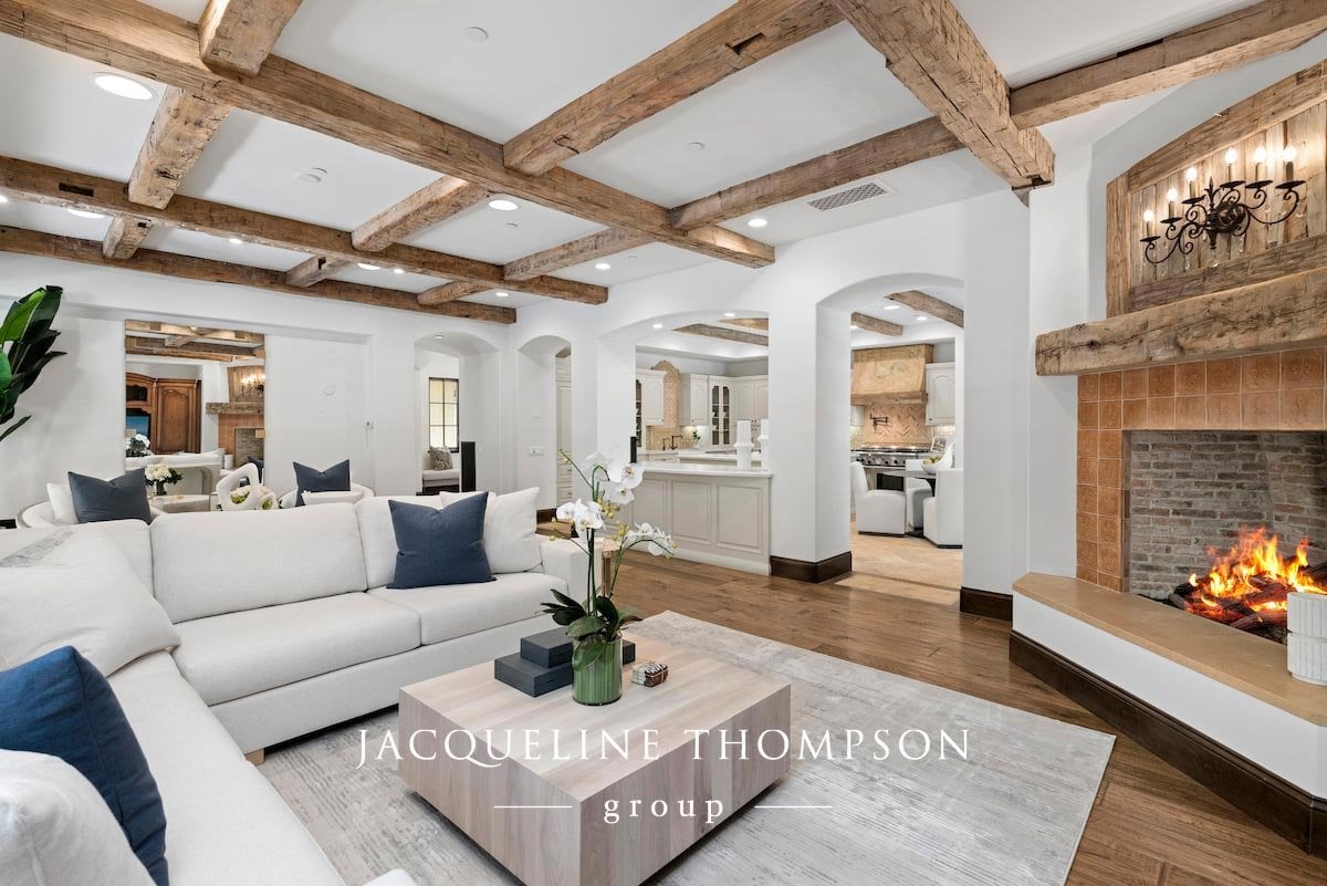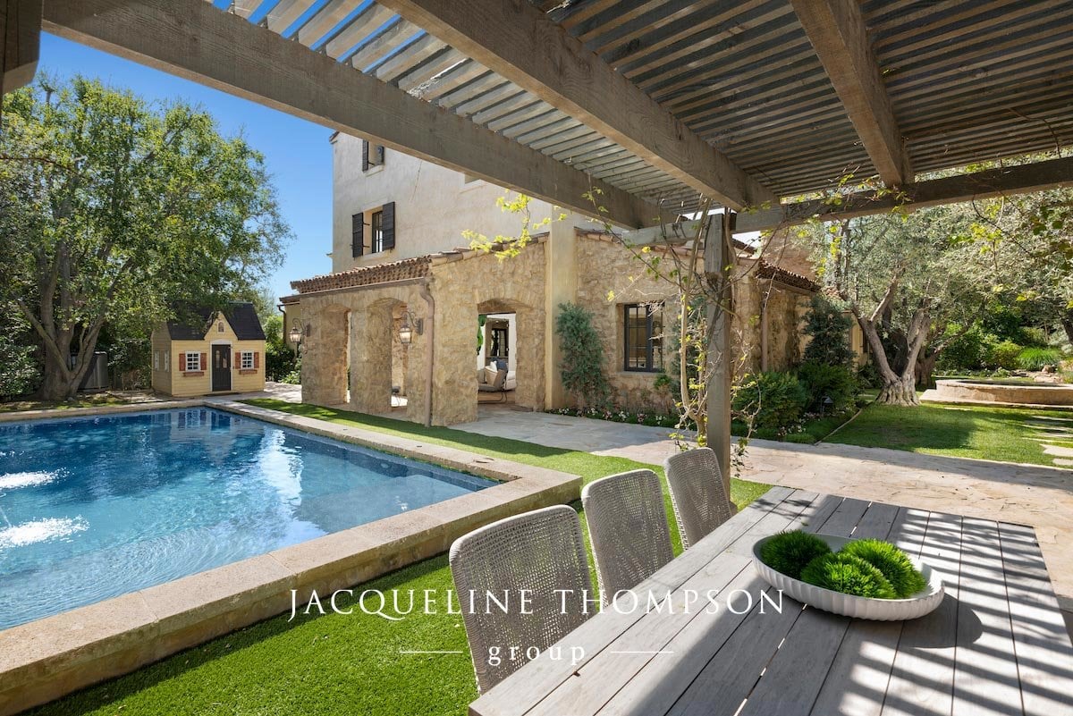 The entertaining layout offers multiple French doors and disappearing pocket door out to the lush grounds with large pool, spa, and numerous sitting and dining areas with trellises providing ample shade. Reminiscent of a quiet country house, the grounds offer the ultimate privacy with mature yet manicured landscaping and trees. For a more formal soiree the dining room and adjacent formal living space offer great ambiance with reclaimed wood beams and a showstopping stone fireplace.