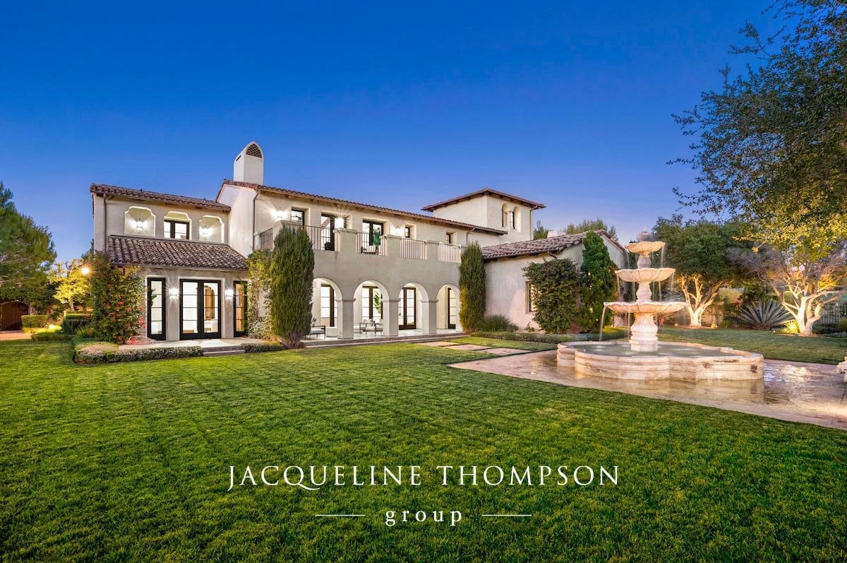 Additionally on this level, the main suite is a fabulous wing that takes in the views of rolling hills and golf course, with a luxurious bath featuring wood paneling on its walls, dual dressing rooms and a stand-alone soaking tub. This California Villa is complete with views and emerald lawns that seem to go on forever and its crowning jewel - an enormous fountain that provides the show stopping centerpiece for any soirée. Additional highlights include its generous driveway, 4-car garage, and tower.