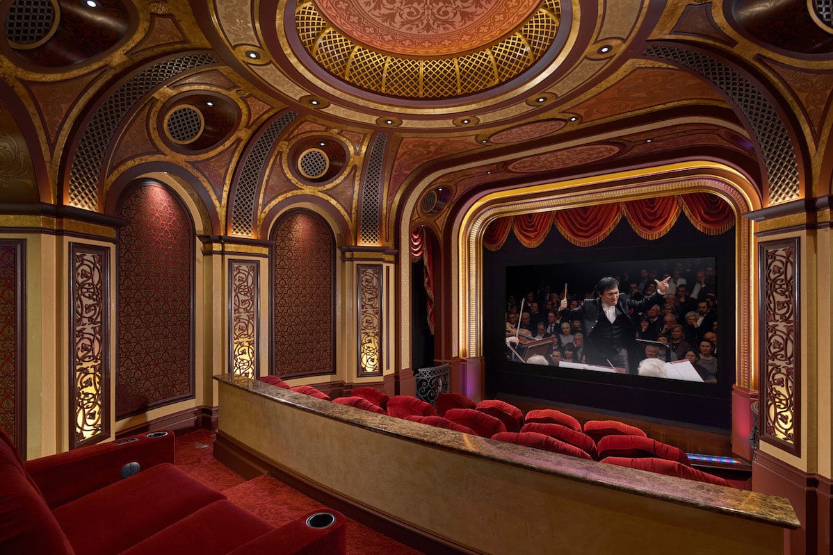 Designed for memorable entertaining, the lower level of the South House features a breathtaking Theo Kalomirakis theater with large-scale lobby with full bar and soda fountain. The theater itself is a feat of artistry, design and engineering, with digitally enhanced acoustics via the Concertino sound system similar to those found in major performance halls, to allow for stunning live musical performances. The commercial-quality theater also includes a stage, motorized curtains, artisan-designed. This theater won CEDIA's coveted Best Overall Home Theater as well as the Gold Technical Design award for theaters costing one million dollars or more.