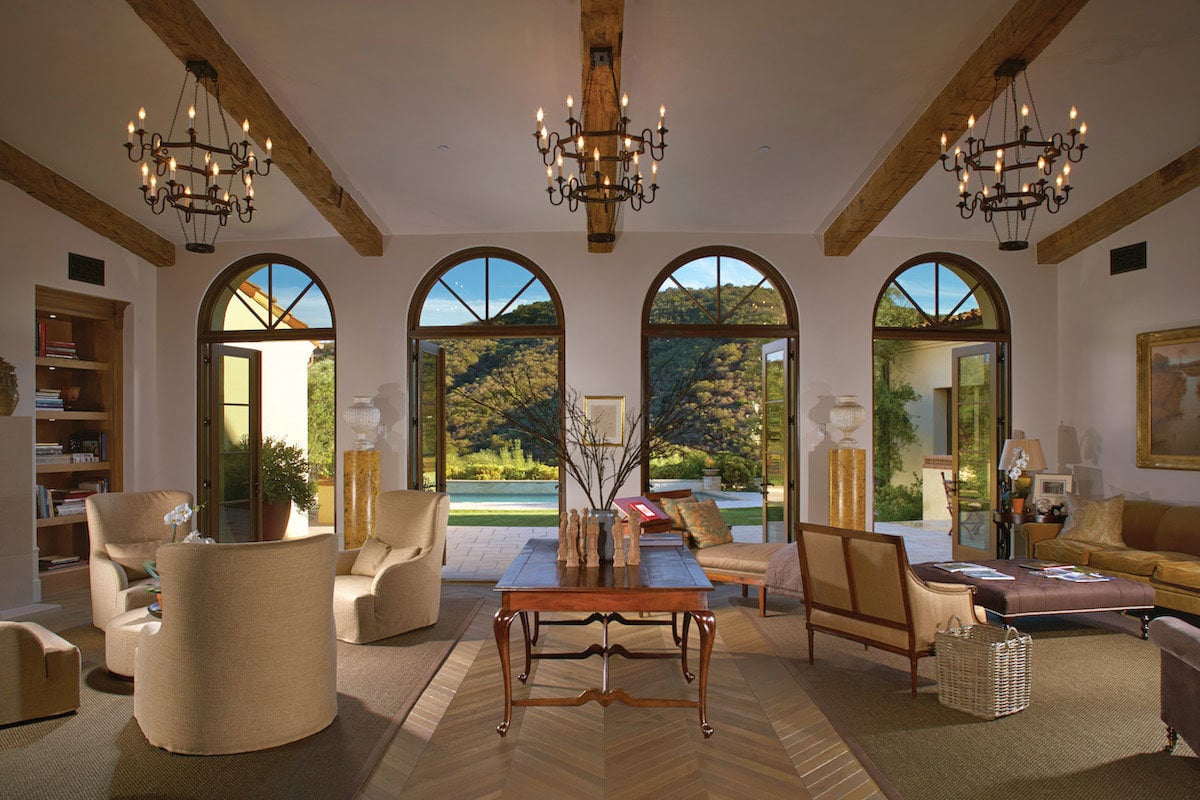 In addition to its impressive size and scenic siting that provides both seclusion and lovely views, the six-bedroom estate also stands apart for its exquisite and innovative architecture, as well as its beautifully sun-washed rooms. Designed by architect Cecil Carney, the home blends the timeless appeal of a Santa Barbara villa with sophisticated loft-like soft contemporary elements, and fabulous European touches. The result is effortlessly elegant, chic-yet-comfortable living on three levels, where wide-open spaces, soaring vintage beam ceilings, custom Venetian plaster walls, and white oak plank floors flow easily from one to another and to the simply gorgeous grounds that are nestled into the canyon.